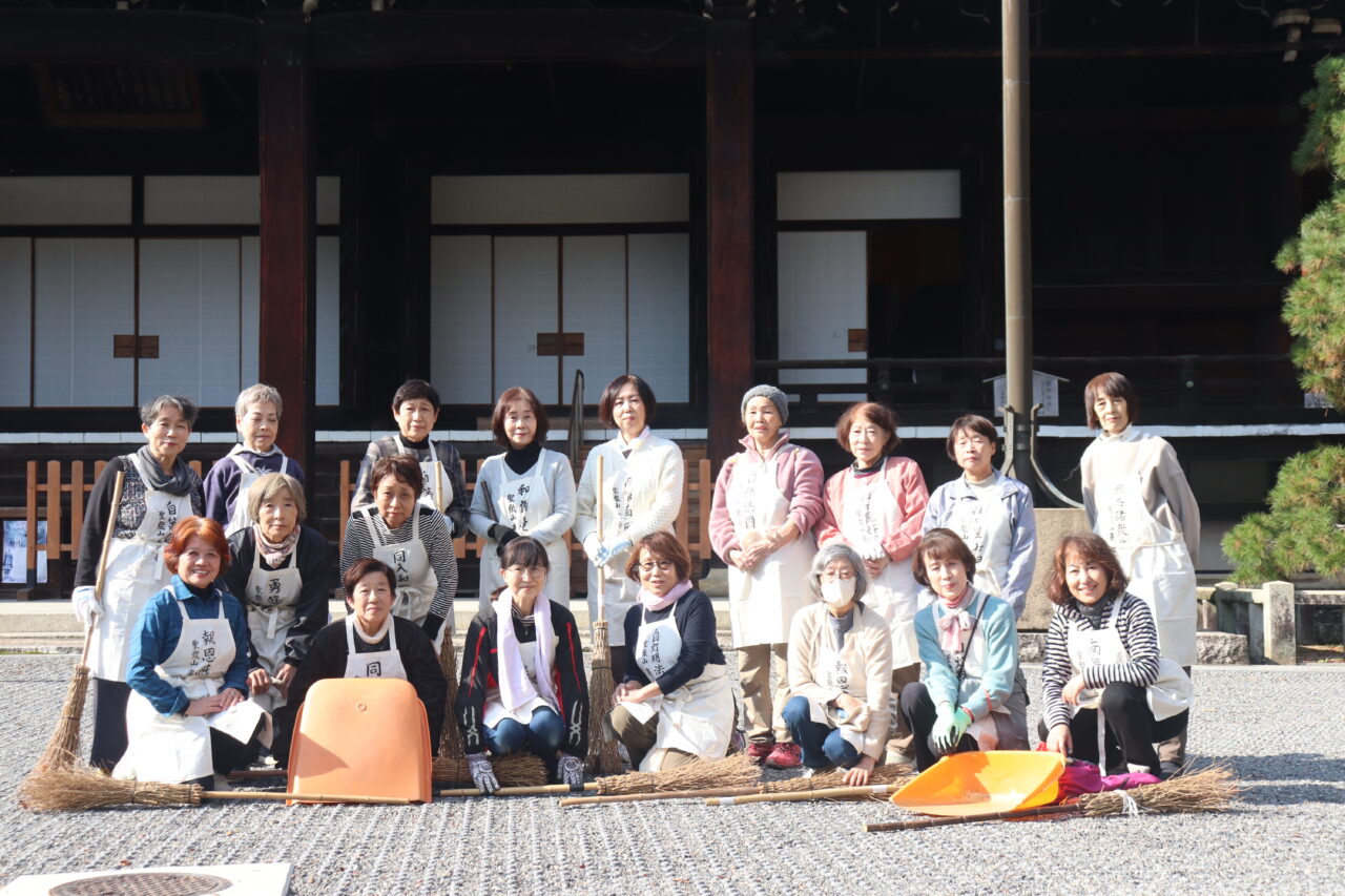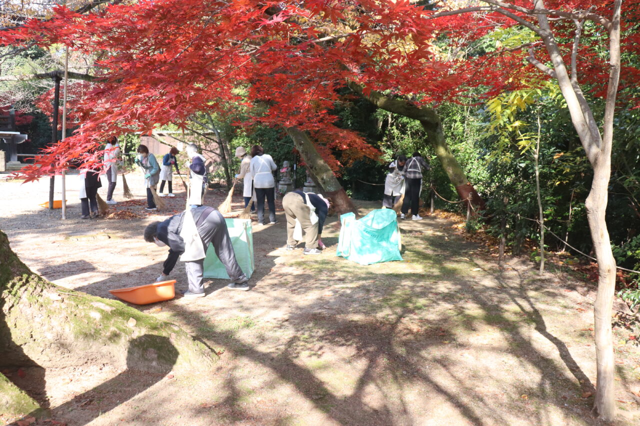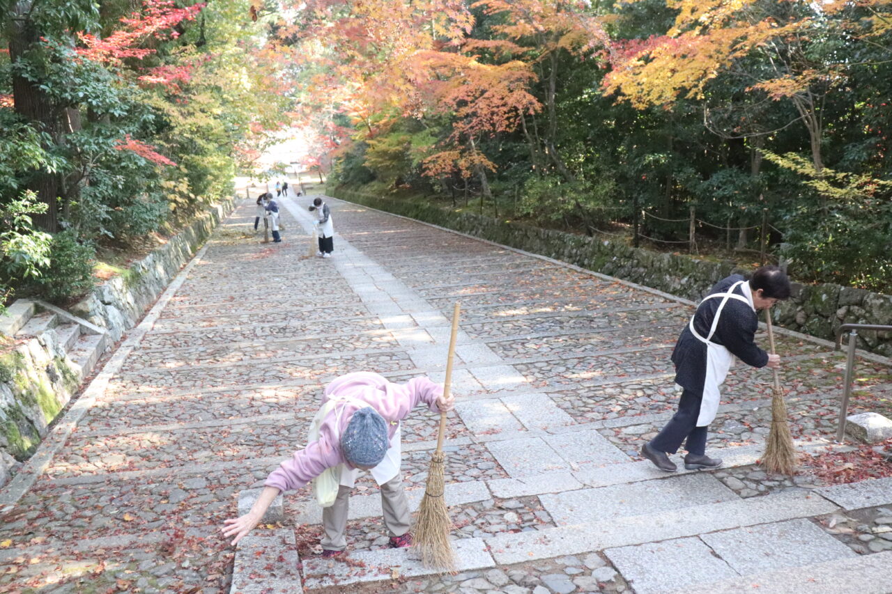 もみじ以外の、葉っぱや小枝などを中心に集めていきます。ほうきを持って履きだすと、みるみるうちに辺りがきれいになっていきます。光明寺婦人会の歴史は深く、およそ100年前より活動が始まりました。奉仕に毎年春と秋に約30ヶ寺の皆さまがご協力いただきご奉仕されていらっしゃるそうです。