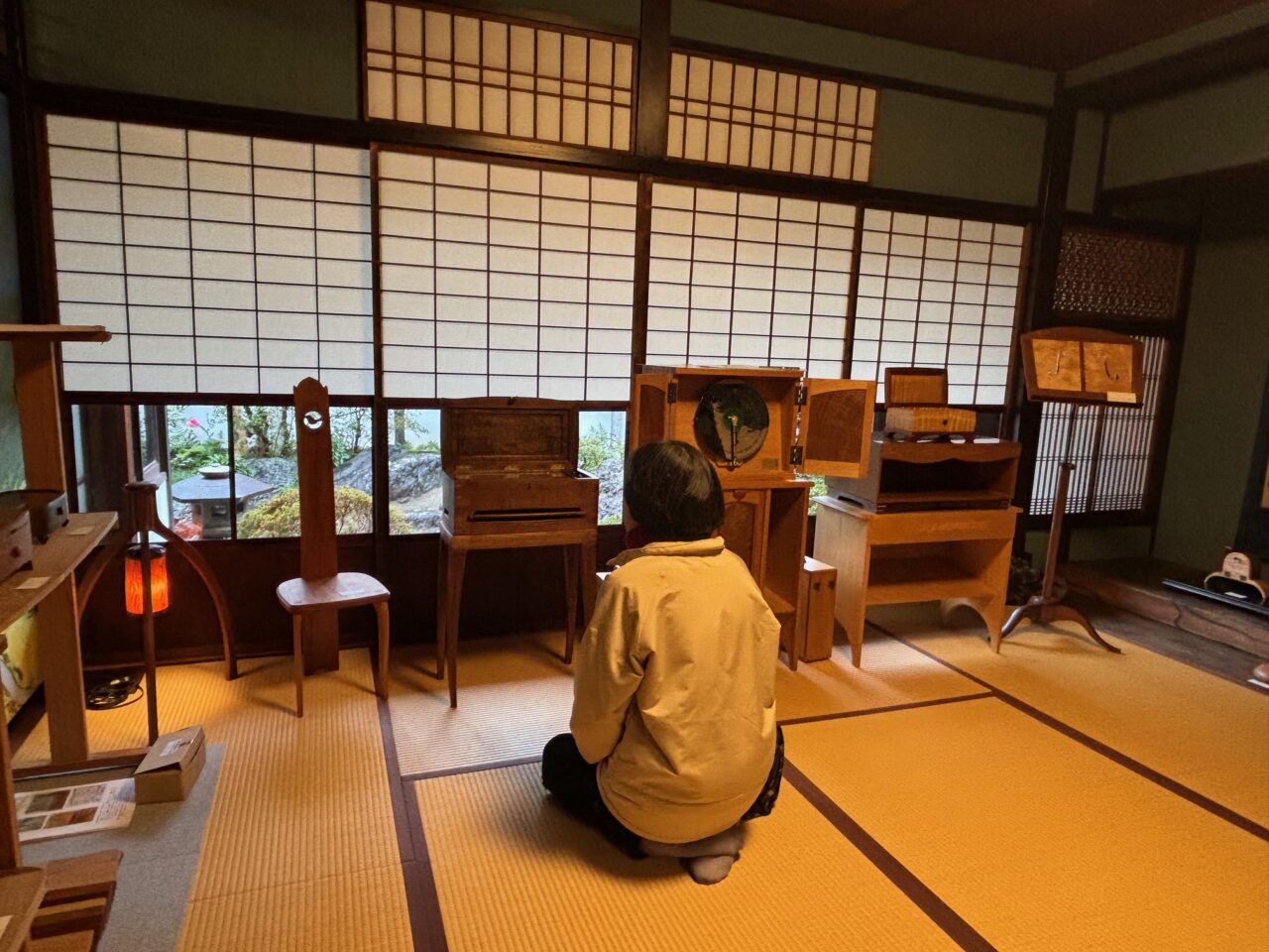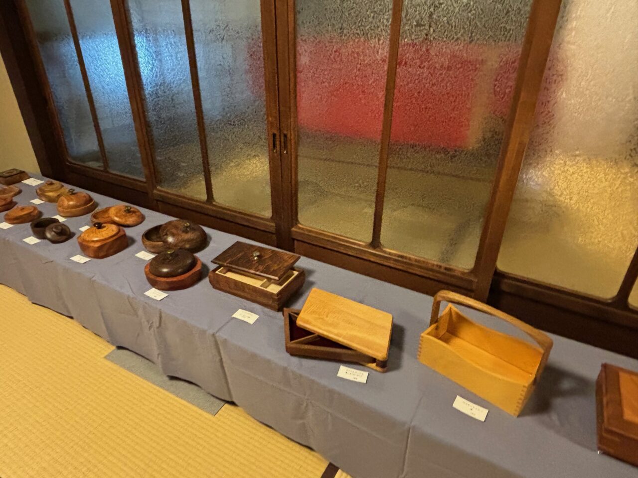 歴史を感じる空間での展示とあって、踏み入れた瞬間からワクワクがとまらなく、住宅の和室とのコラボレーションがさらに作品を引き立てます。手作りのあたたかみのある木工作品は、シルエットがとてもきれいで曲線とオリジナルの形がやわらかくほっとする作品です。木の温もりを感じる木工作品を近くで見るとパワーをもらえますよ。