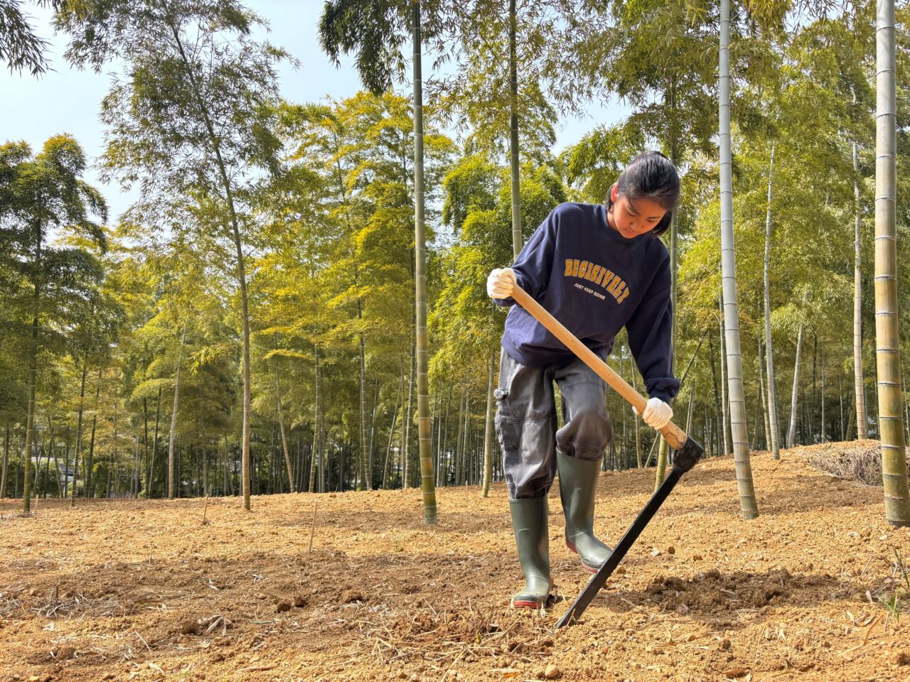 丁寧に整備された明るい竹林の中では、ちょっともっこりっした土やひび割れた場所にたけのこが少し頭を出します。その場所を探して掘っていきます。